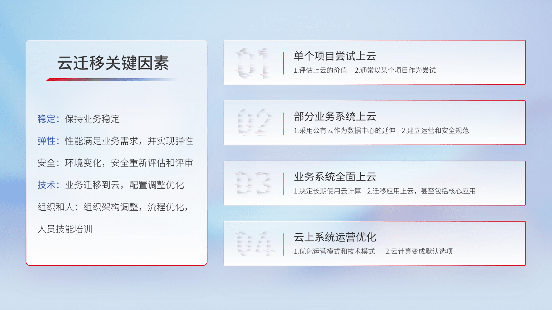 结合实际业务,,从规划设计、、、云平台选型、、云原生改造、、数据迁移、、集成交付,,迁移全过程为客户识别最佳上云路径,,,,做好风险识别管理,,,设计网络架构、、身份权限、、、、安全审计合规、、、操作审计、、日志审计、、监控告警策略、、、多站点容灾设计等,,,对云上基础设施进行整体规划,,,,提升IT治理水平,,,,以满足弹性、、高可用、、高性能的需求。。。