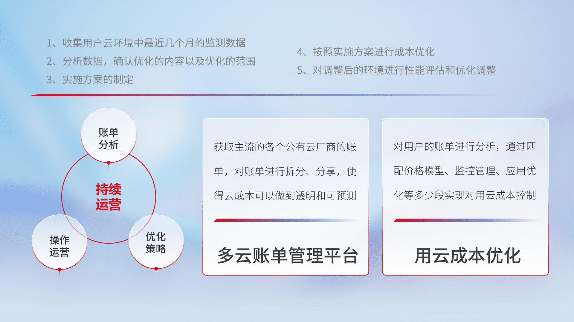 通过多云纳管,,,,以统一的资源数据模型把客户的云资源进行抽象和封装,,进而实现对多云资源的统一操作,,,保障云资源管理的可靠性、、稳定性与可用性。。。量身定制化运维内容,,,配置、、、开发运维、、、补丁管理、、、备份、、、、监控、、认证和访问管理、、、审计和日常巡检等,,,,保障在用云过程中的可靠度,,,,稳定度以及高可用率。。。。
